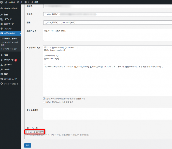 送信元:お問い合わせの送信元メールアドレス(後述するWP Mail SMTPで利用するメールアドレスを指定します。)