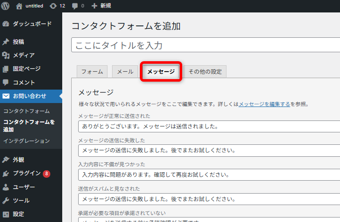4-3. メッセージタブでは問い合わせフォームでの各種表示メッセージを編集します。