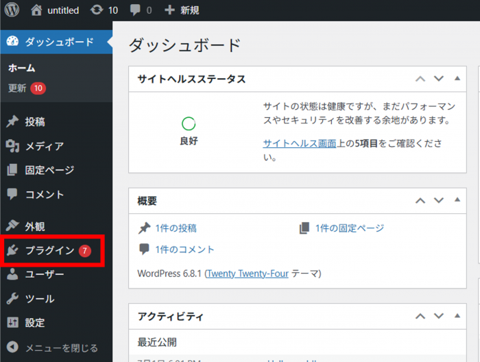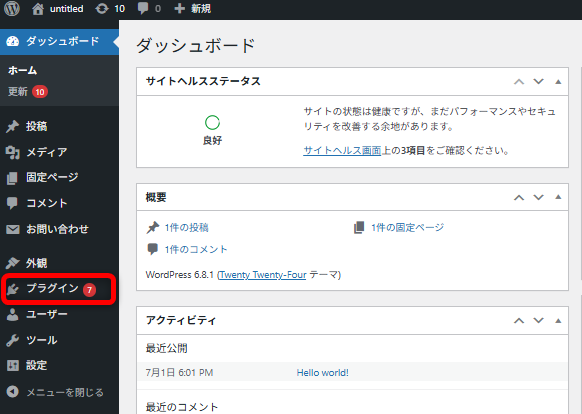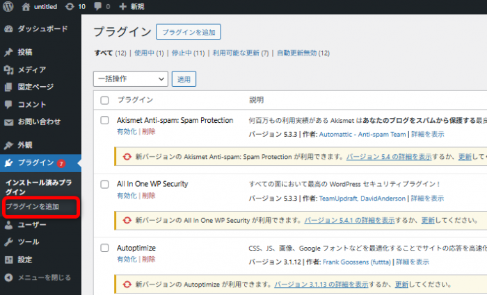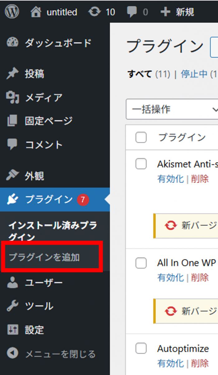 1. WordPress管理画面の左側のメニューより「プラグイン」をクリックします。