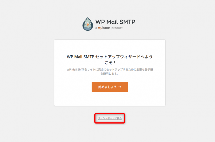 6. WP Mail SMTPセットアップウィザードへようこそ!の画面が表示されるので「ダッシュボードに戻る」をクリックします。