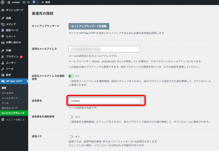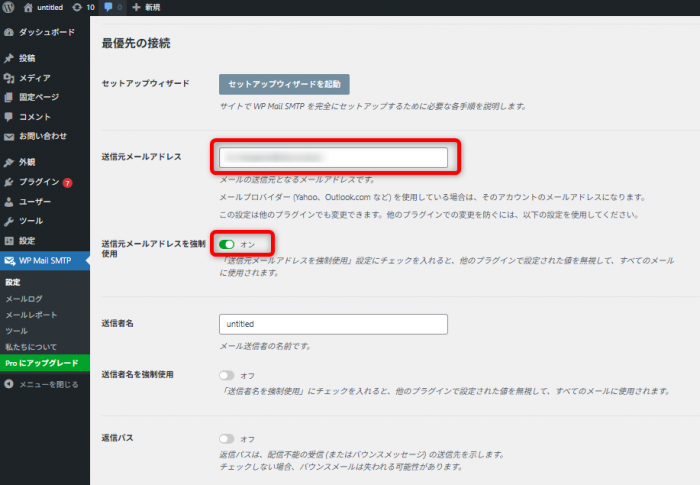 ※送信元メールアドレスを強制使用のチェックは「オン」に設定しておきます。