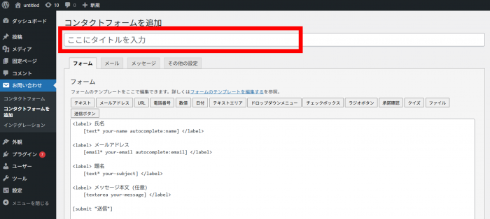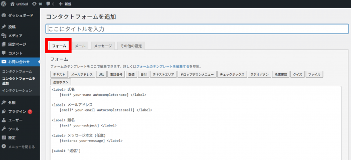 4-1. フォームタブではお問い合わせフォームの内容を編集します。