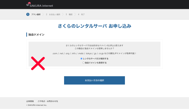 レンタルサーバーのご契約を先に行う場合は、合わせてドメインのご契約をせずに必ずドメインは当ページ内の「ドメインお申し込みボタン」から別途お申し込みください。